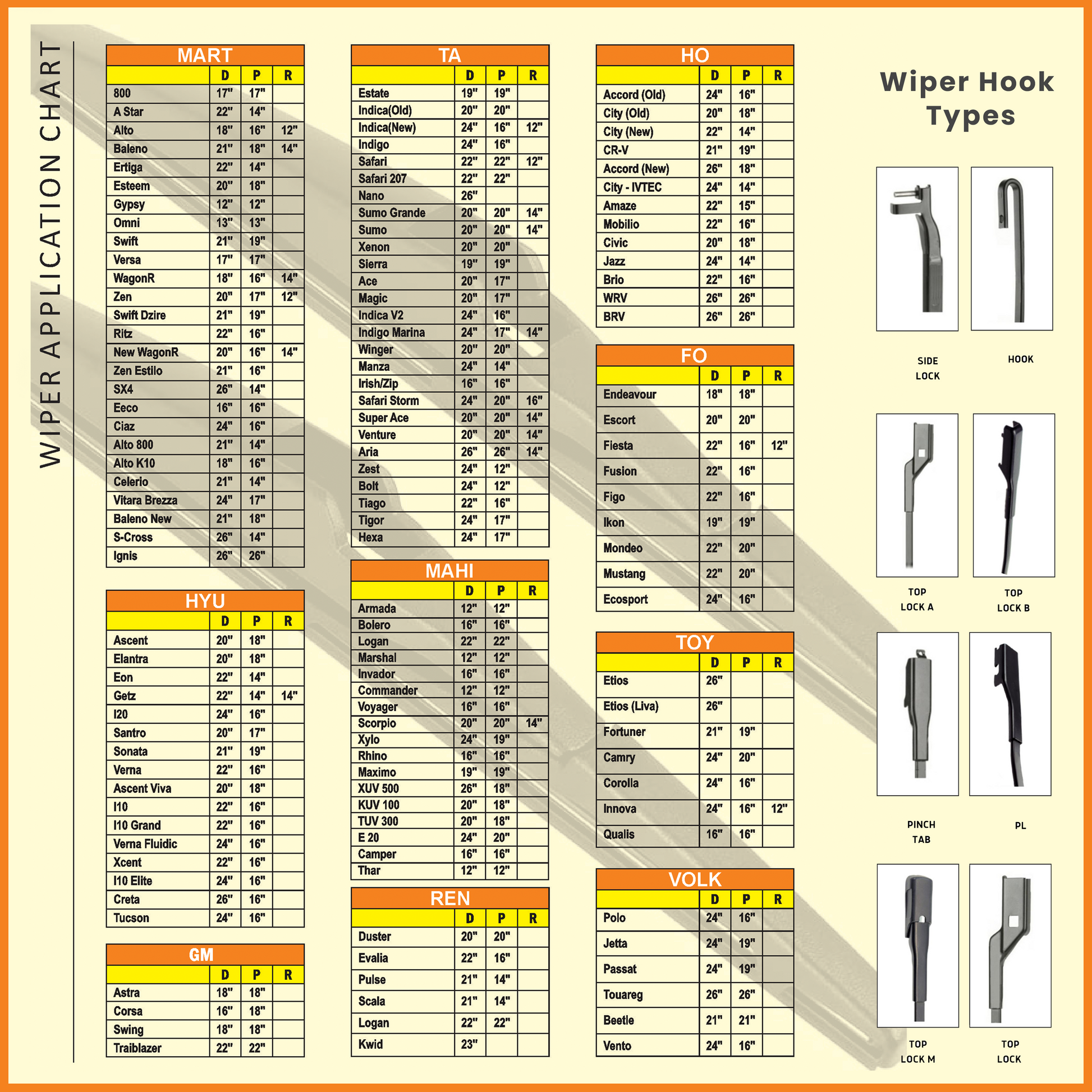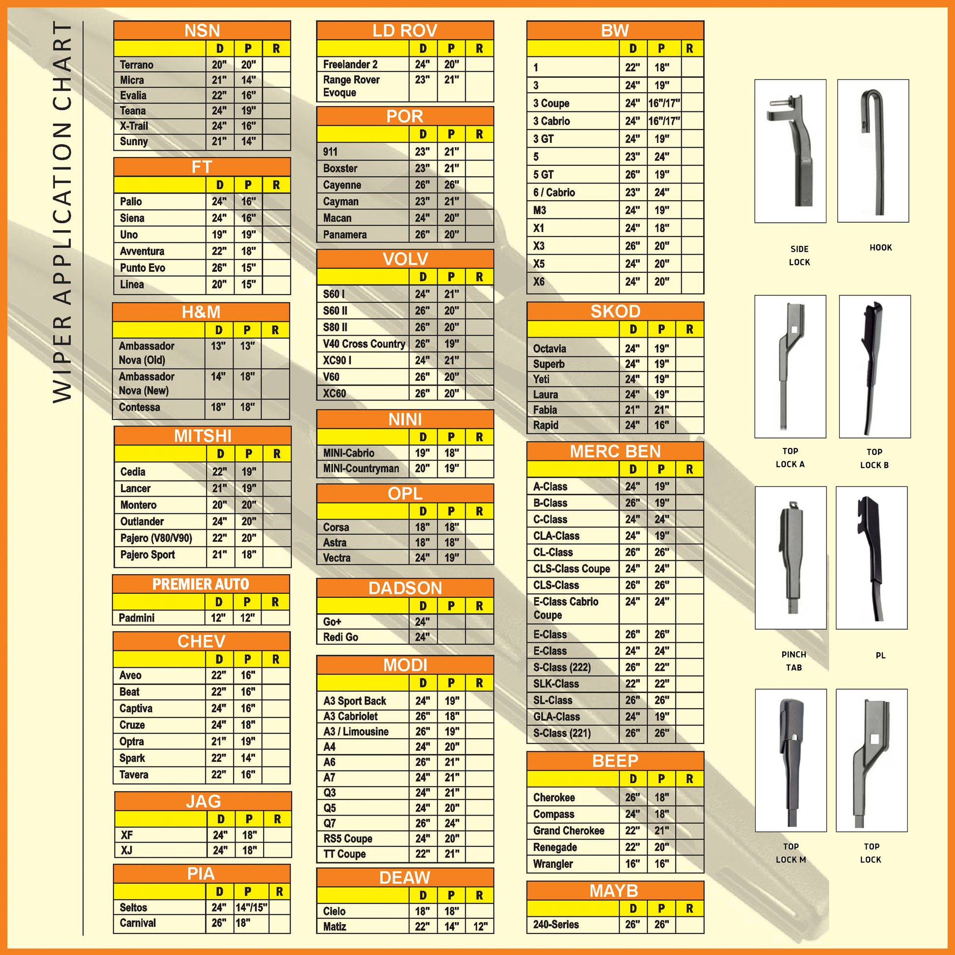 - Check the attached wiper application chart to find the correct wiper size for your car.