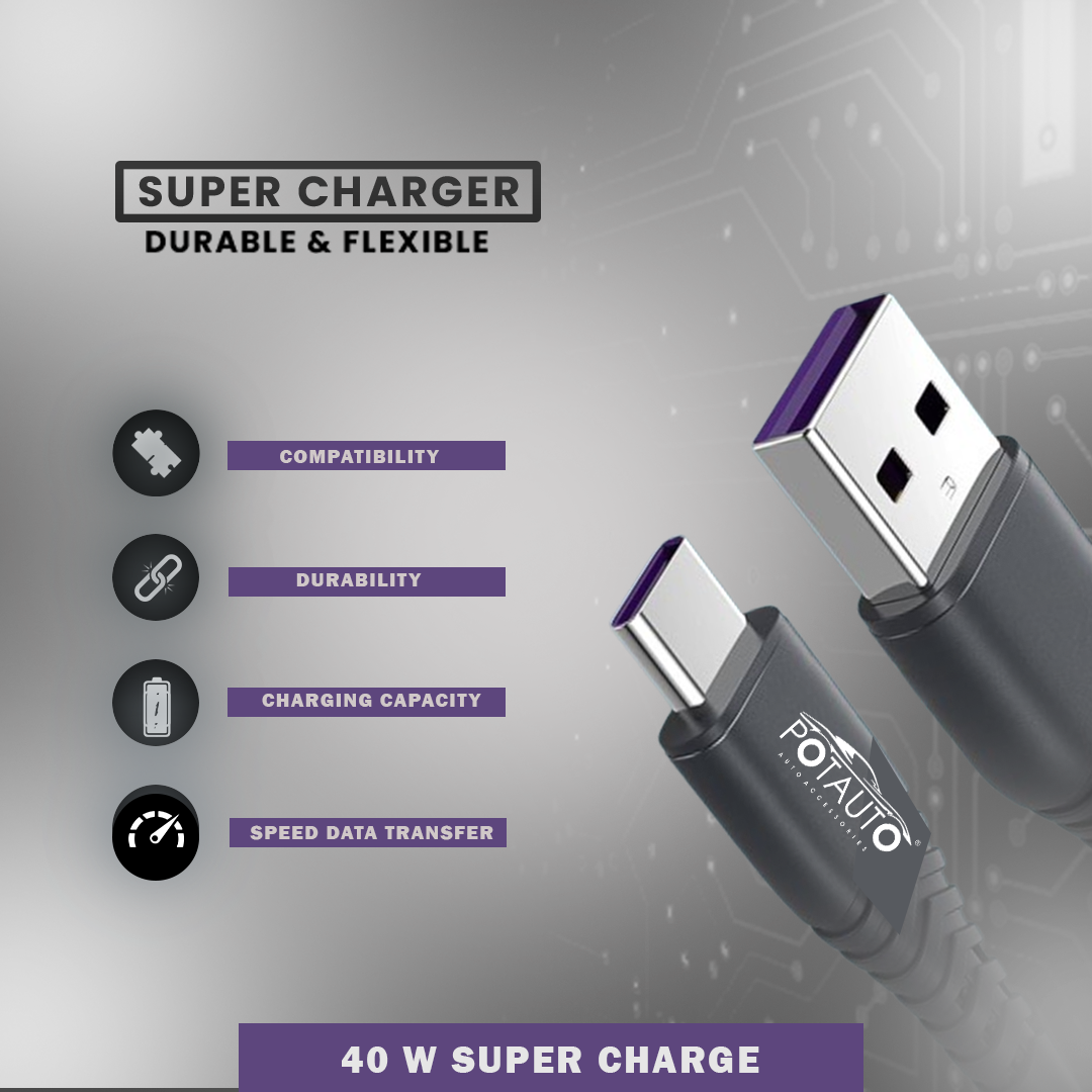 POTAUTO USB to Type-C 40W Fast Charging Cable – High-Speed Data Transfer, Compatible with Smartphones, Tablets & More (1M, Black)